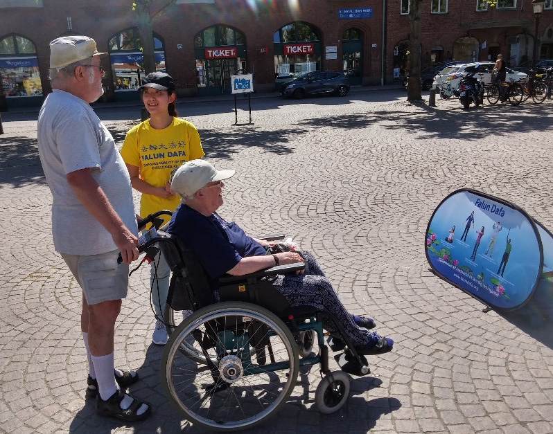 还有一位男士走向学员说:“可以请你给我的朋友讲讲法轮功吗?”原来,他曾遇见法轮功学员在丹麦哥本哈根和瑞典的赫尔辛堡的洪法活动,了解很多关于法轮功的真相,可是他的朋友并没有听说过法轮功。听了学员的讲解,尤其是活摘器官,他的朋友不由得惊叹,感到震惊,并在反活摘征签板上签字。他们与学员交流了很久,并也想要开始学炼法轮功。