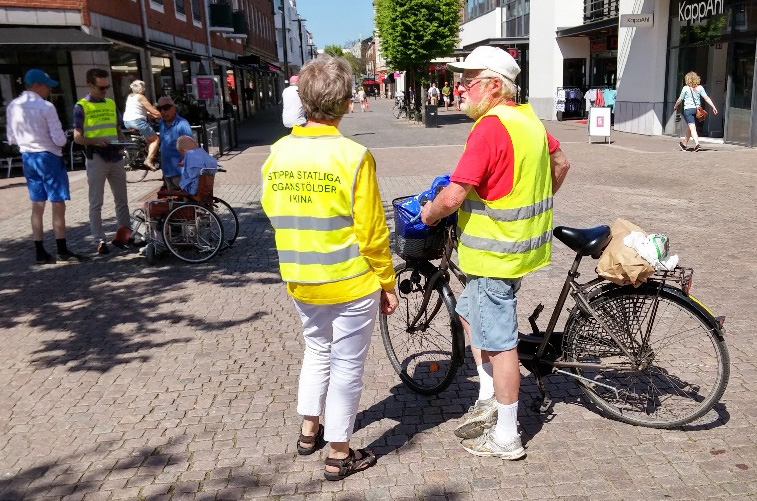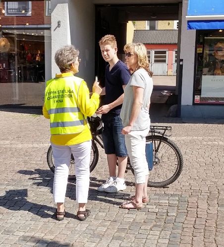 二零一七年五月二十七日,小镇天气晴朗,瑞典南部的部分法轮功学员在这里向民众介绍法轮功,进行功法展示和反活摘征签。
