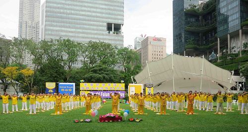图2~3:二零一七年五月二日,新加坡法轮功学员在芳林公园庆祝即将来临的世界法轮大法日。图为学员们正在集体炼功。