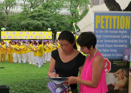 '图7~9:二零一七年五月二日,新加坡法轮功学员在芳林公园庆祝即将来临的世界法轮大法日。图为各族裔民众了解真相后签名支持法轮功学员反迫害。'