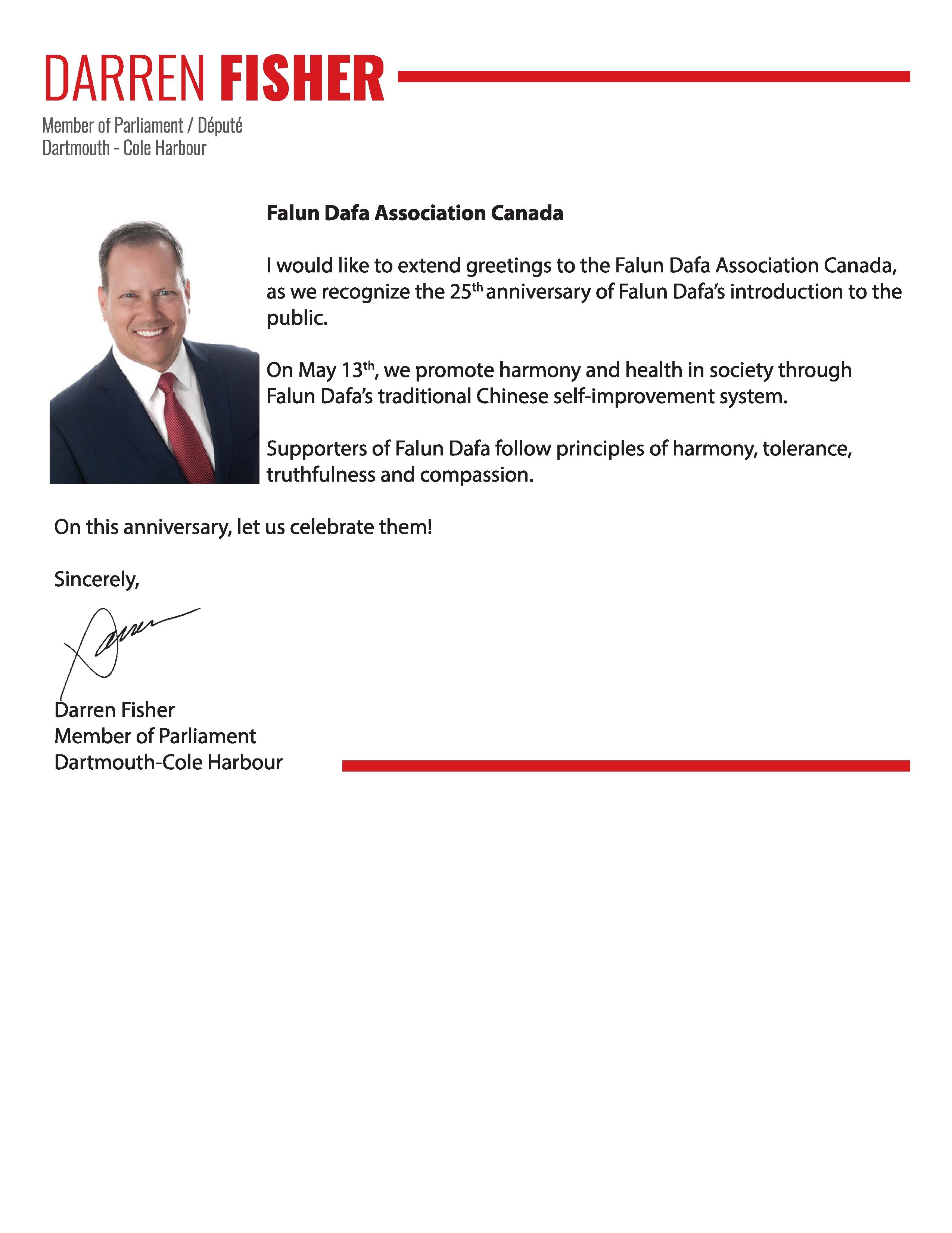 新斯科舍省Dartmouth-Cole Harbour选区联邦国会议员Darren Fisher在贺信中写道:“在我们纪念法轮大法传世25周年之际,我要向加拿大法轮大法学会表达我的问候。”他在贺信中表示:“法轮大法用传统的中国自我提升理念为社会带来了和谐与健康,在5月13日这一天,我们将其推而广之。”