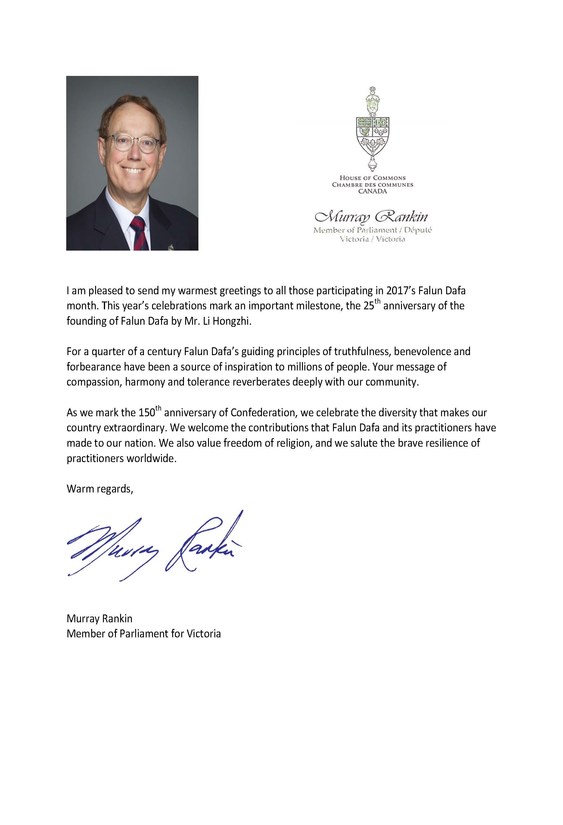 加拿大国会议员Murray Rankin在贺信中表示:“四分之一世纪的时间里,法轮大法的真、善、忍的指导原则成为数百万人的精神来源。慈悲、和睦和宽容的信息在我们的社区深深地回荡。”“在纪念加拿大建邦成立150周年之际,我们庆祝使我们国家非凡的多样性。我们欢迎法轮大法修炼者们对我们国家的贡献。我们也重视宗教自由,我们向全世界有信仰人们的勇敢的韧性致敬。”