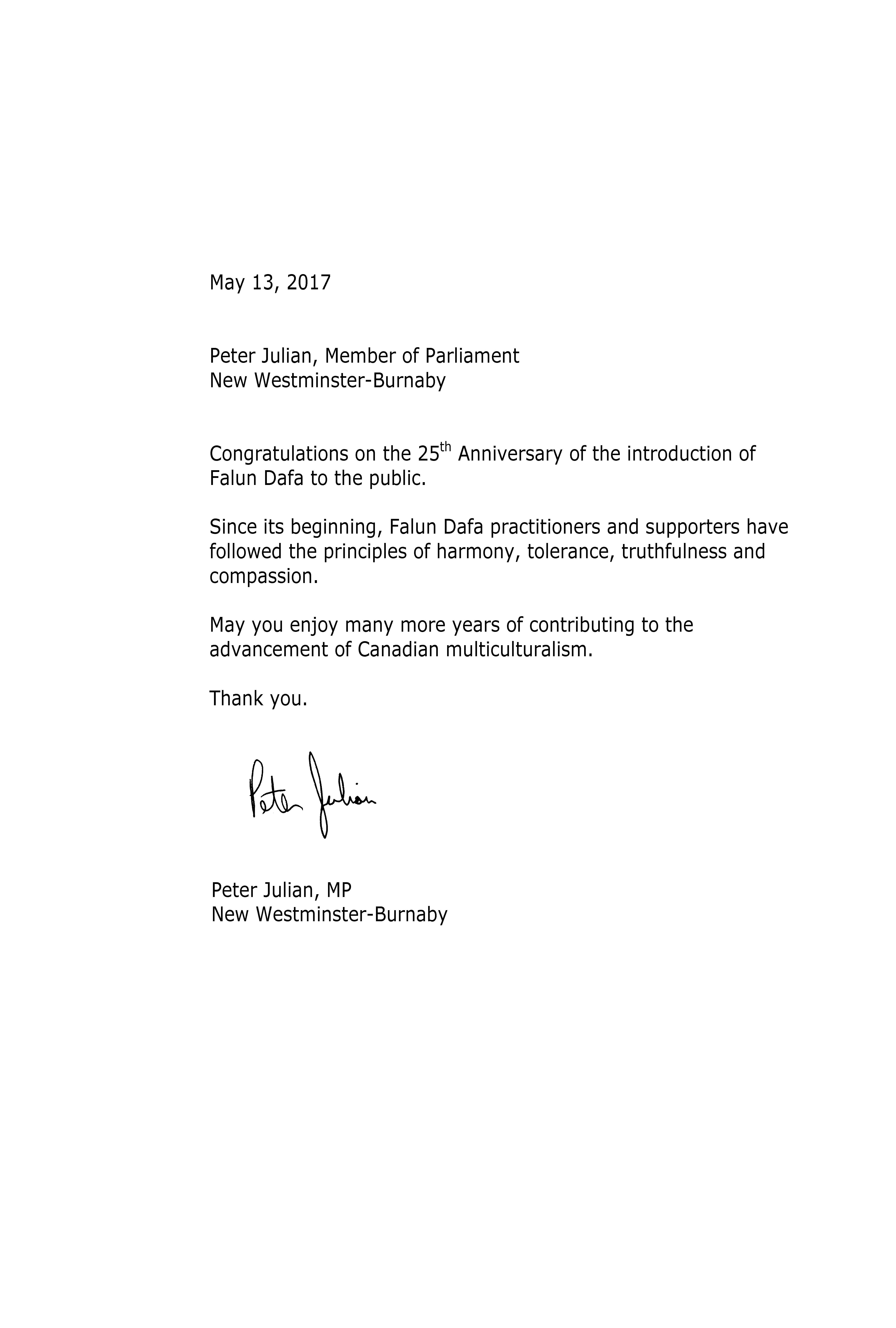 加拿大卑诗省本拿比-新西敏选区(New Westminster-Burnaby)国会议员朱利民(Peter Julian)在贺信中表示:“祝贺法轮大法面向公众传播二十五周年。法轮大法自开始以来,遵循和谐,宽容,和真善忍的理念。多年来,你们为加拿大多元文化的进步做出贡献。”