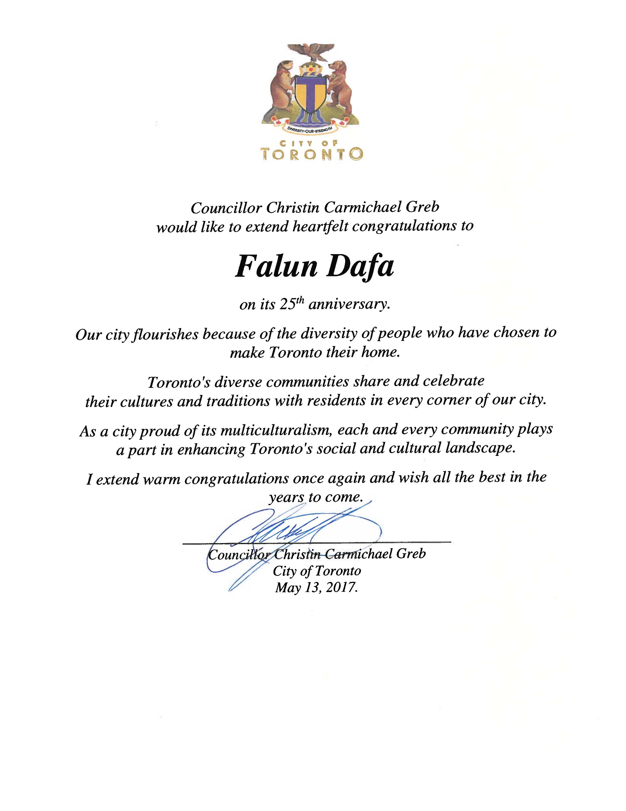 多伦多市议员卡麦可•格丽布(Christin Carmichael- Greb)女士为法轮大法日发出的贺信表示:“市议员卡麦可•格丽布在第25届法轮大法日衷心祝愿法轮大法。”