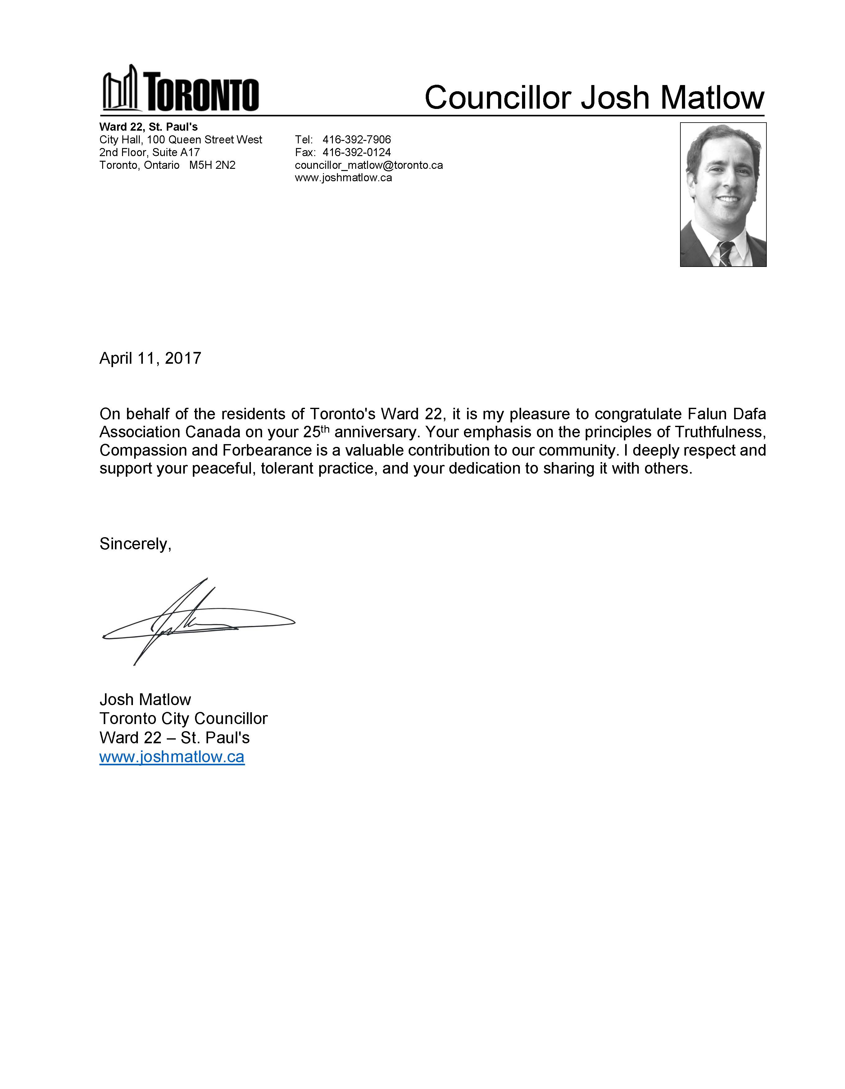 多伦多市议员Josh Matlow在贺信中说:“谨代表多伦多22选区,我很荣幸能在此祝贺加拿大法轮大法学会庆祝法轮大法传世25周年庆祝活动。”“你们遵循真、善、忍的原则为我们的社区作出了积极贡献。我由衷尊重你们和平、宽忍的践行,以及你们与他人分享这样理念的不懈努力。”