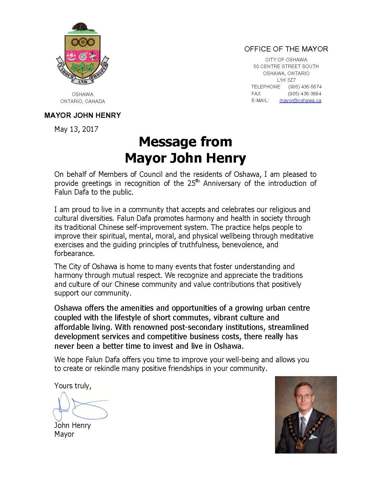 ![]() 奥沙华(Oshawa)市John Henry 市长贺信 |