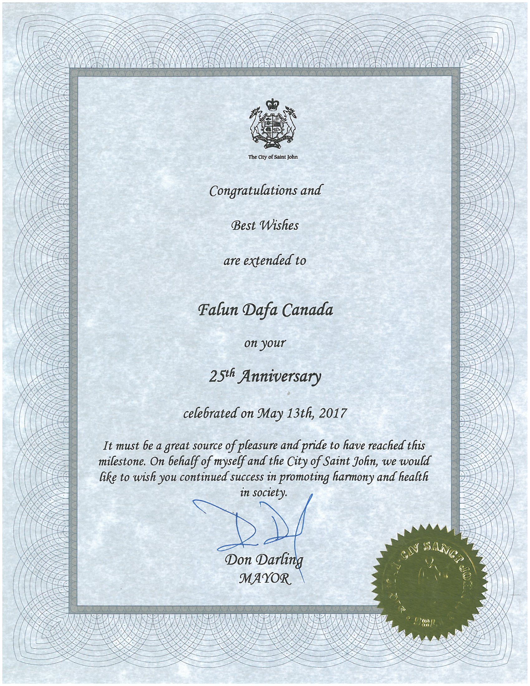 圣约翰(Saint John)市Don Darling市长在贺信中说:“相信这一定是一个里程碑一样的日子,值得让人欢喜与由衷的自豪。在此谨代表我与圣约翰市送上我们真挚的祝愿,希望你们能继续的成功,为社会带来更多的和谐与健康!”
