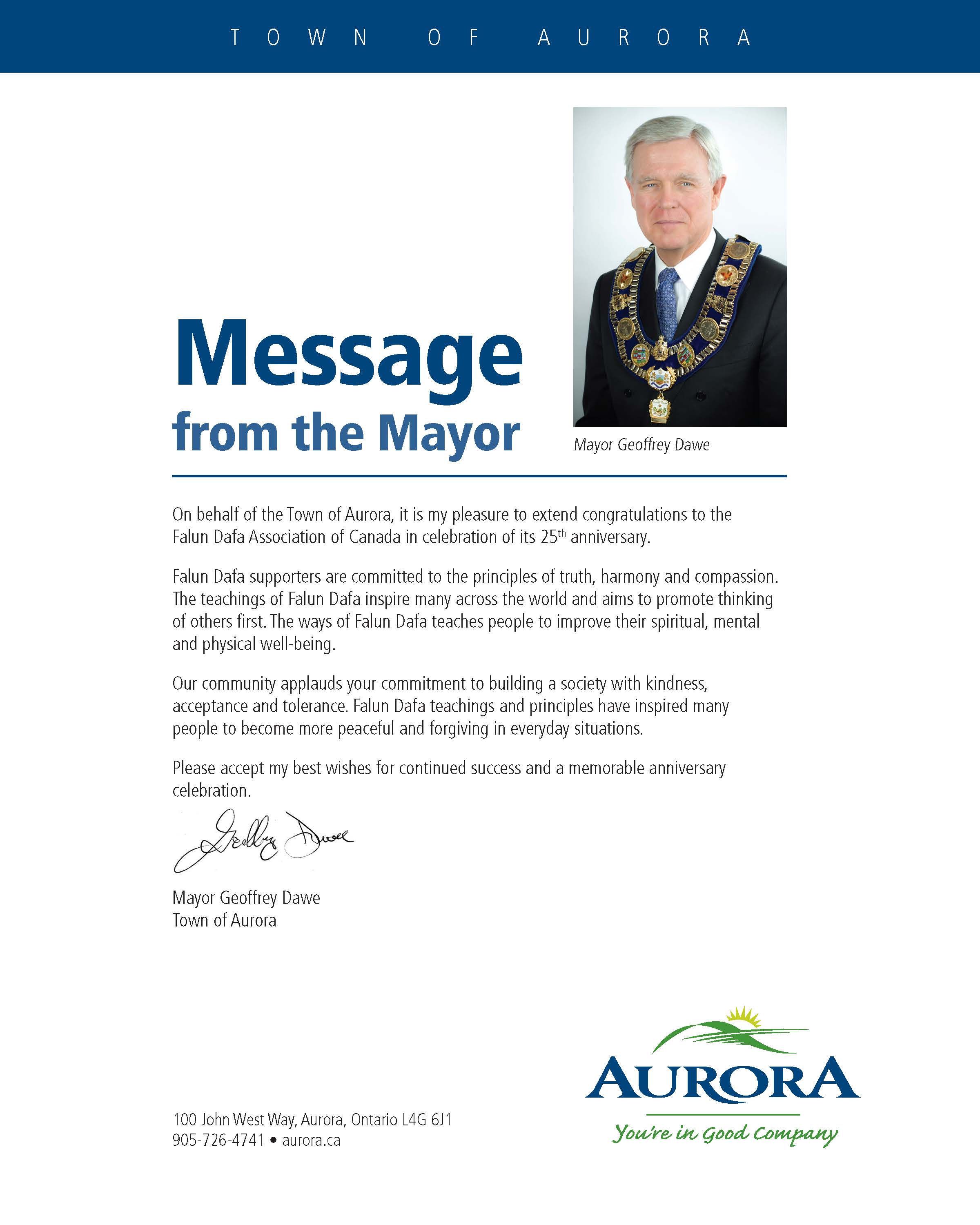 Aurora 镇镇长Geoffrey Dawez在贺信中表示:“法轮大法的支持者秉承着真诚、和谐和慈善的原则做事。法轮大法教导人们先他后我,给世界上许多人带来了启发。同时,法轮大法教导人们如何提升精神,思想和身体的健康。你们对建设一个善良,包容的社会所做出的投入与付出得到了我们社区的赞佩。法轮大法的原则与教导启发了许多人,使他们能够平和,从容的面对日常生活。”