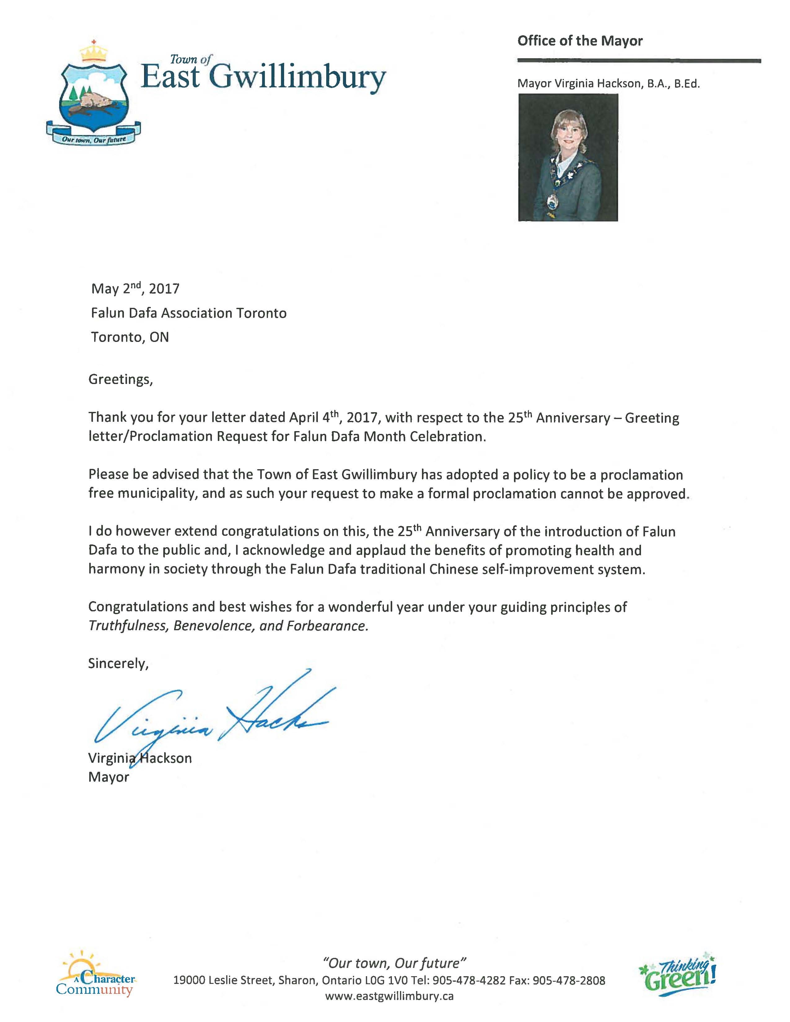 ![]() East Gwillimbury镇镇长Virginia Hackson 女士贺信 |