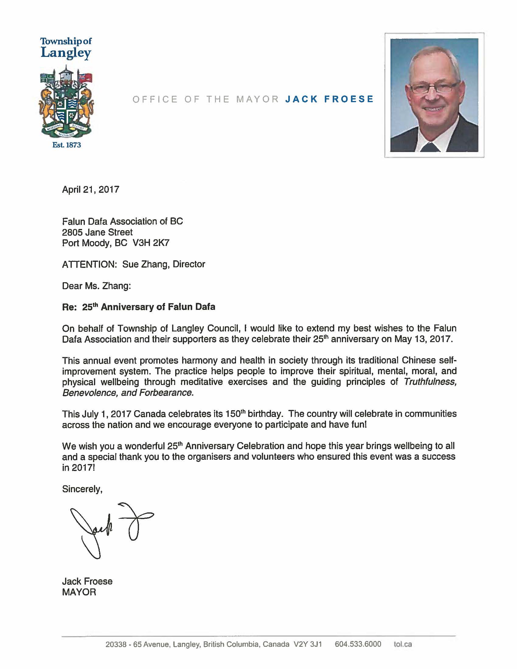 ![]() Township of Langley市市长Jack Froese先生贺信 |