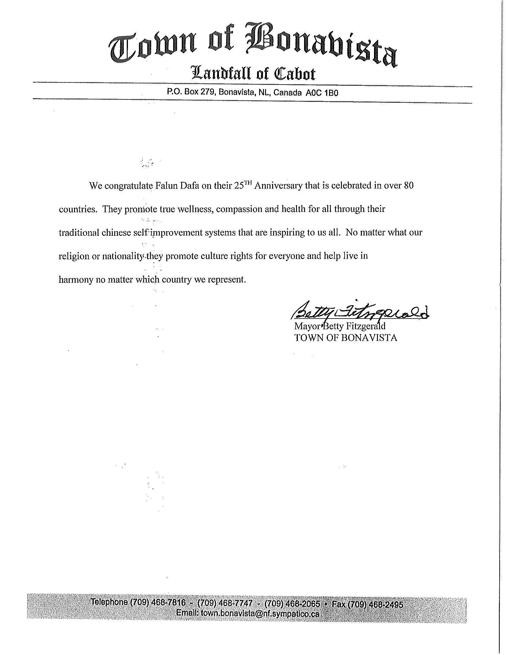![]() Bonavista市Betty Fitzgerald镇长贺信 |