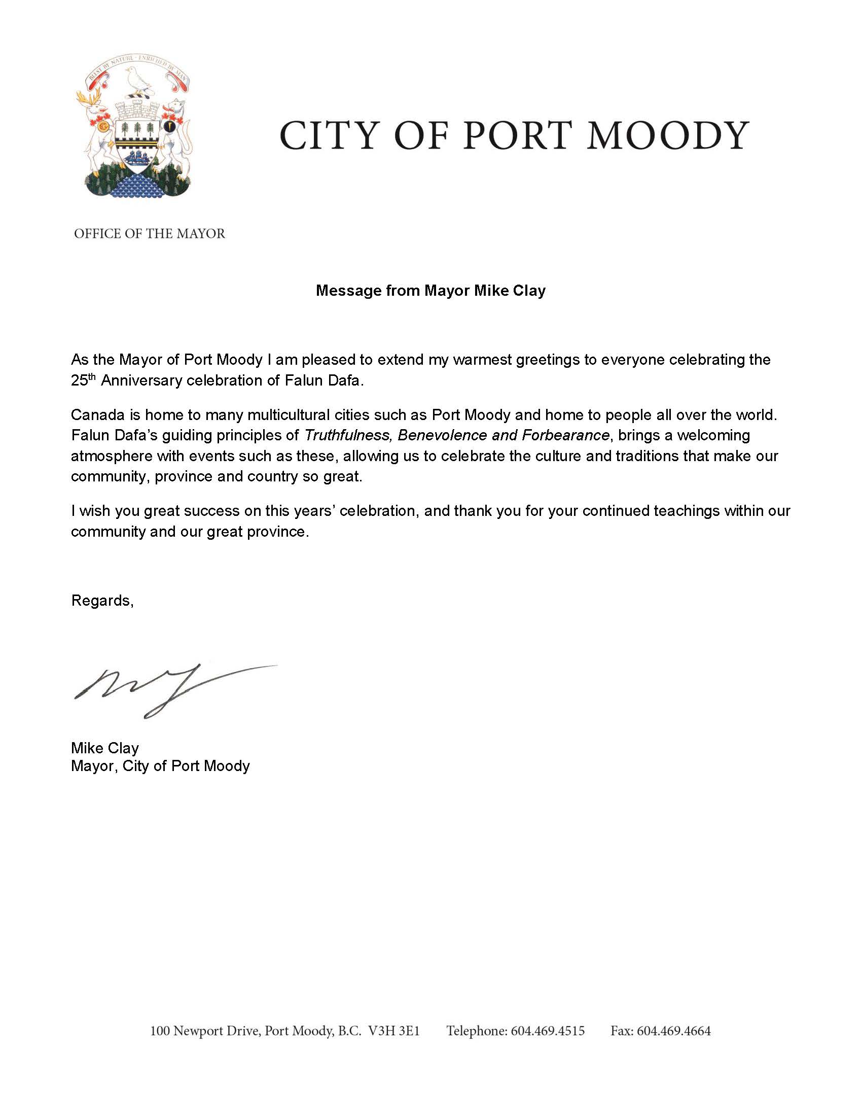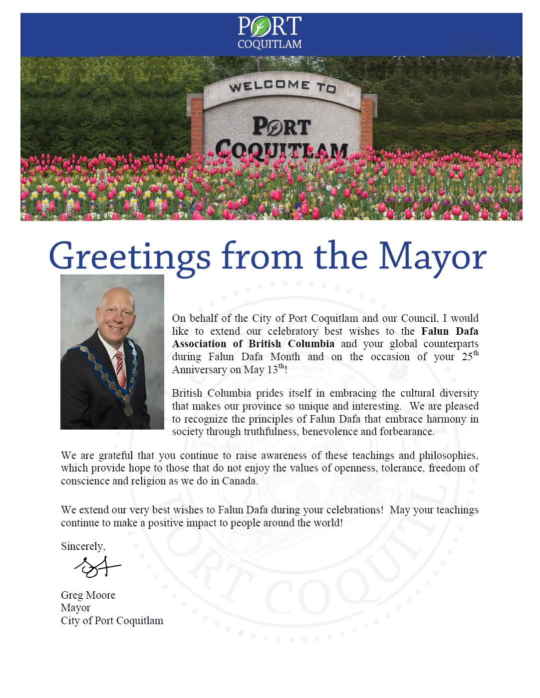 ![]() 高贵林港(Port Coquitlam)市长格雷格摩尔(Greg Moore)的贺信 |