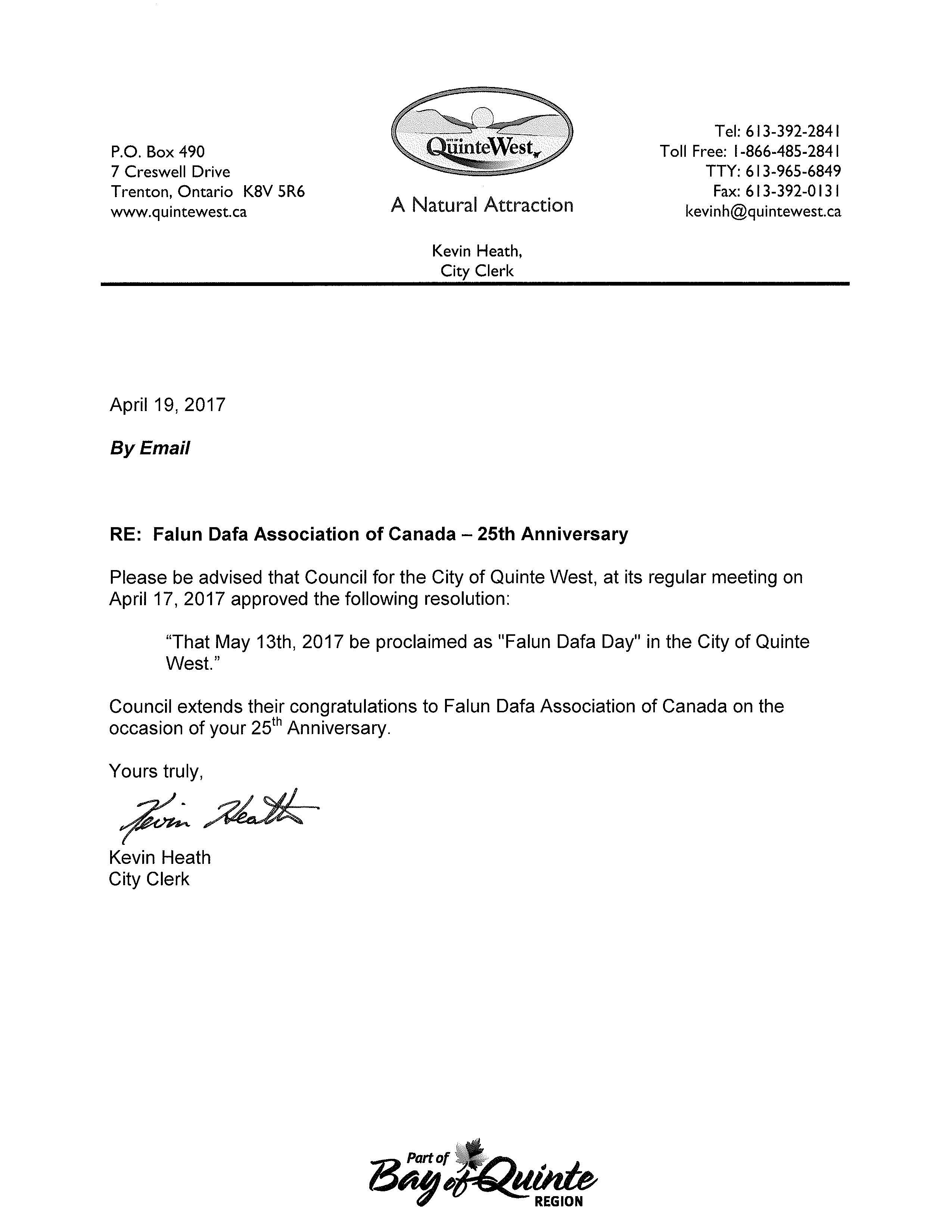 ![]() Quinte West市宣布5月13日为法轮大法日褒奖 |
