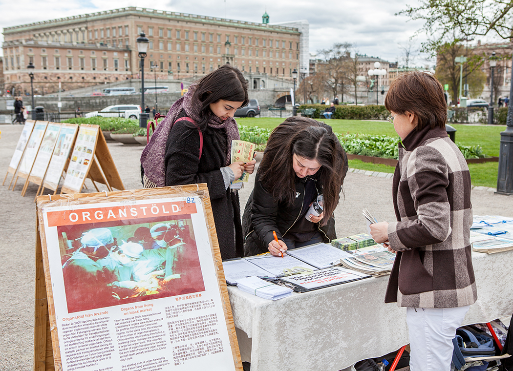 在四个多小时的活动中,西人学员克里斯蒂娜(Kristina)、琵丽尤(Pirjo)、温纳(Werner) 、托比亚斯(Tobias)、索菲亚( Sofia)几位西人法轮功学员先后发言,他们用英语、瑞典语向过往民众介绍什么是法轮功(法轮大法)、大法在世界弘传的盛况同时揭露中共如何迫害法轮功,以及活摘法轮功学员器官罪行。很多人驻足观看真相展板,主动上前了解真相。了解了真相后的人们都对法轮功很感兴趣,有的当场就要学功。