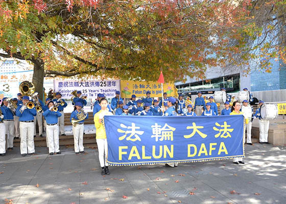 五月六日,在世界法轮大法日前夕,墨尔本法轮功学员以集体炼功的形式,恭祝法轮大法创始人李洪志先生华诞暨大法洪传25周年。