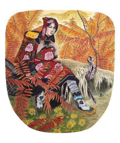 作品说明:表现鄂伦春少女学员在山道上小憩,为散居的鄂伦春族的游民请来大法书。