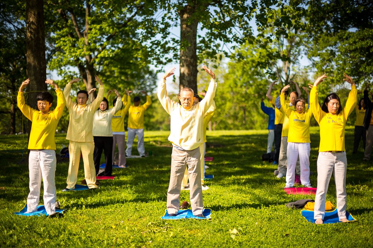 ![]() 图:法轮功学员在圣路易市森林公园集体炼功,庆祝即将来临的世界法轮大法日 |
