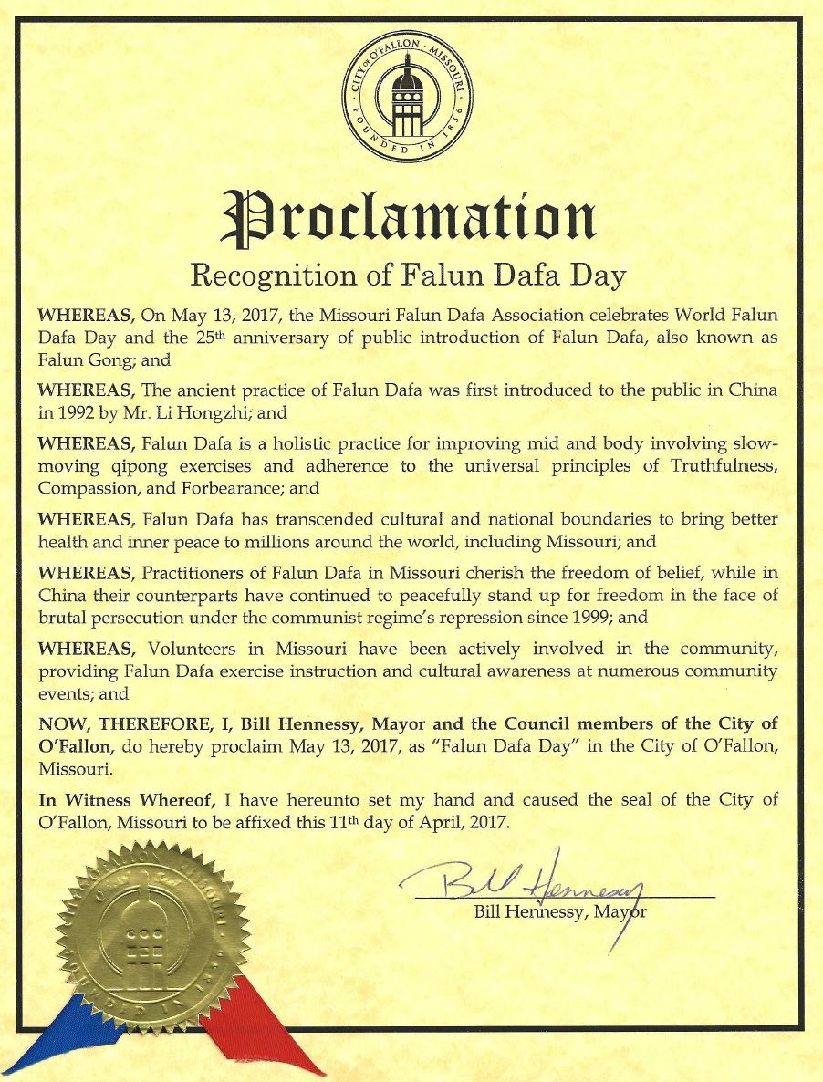 鉴此,我,比尔·汉尼斯,奥法隆市市长和市议会宣布二零一七年五月十三日为密苏里州奥法隆市的法轮大法日。