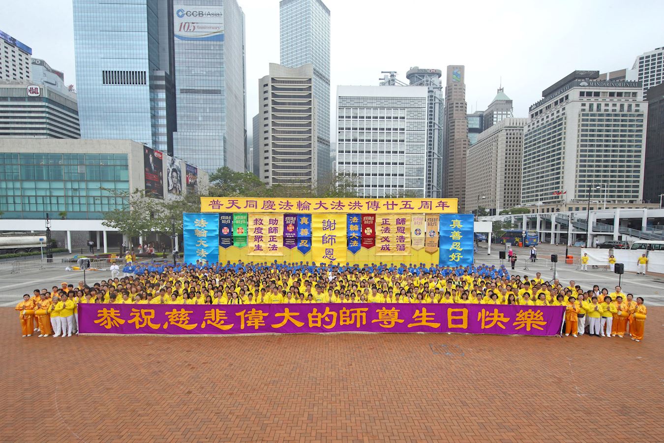 '图1:香港法轮功学员在港岛举行集会,向法轮功创始人李洪志先生贺寿,并庆祝世界法轮大法日。'