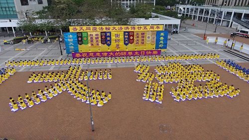 '图2~5:法轮功学员在香港中环爱丁堡广场上排字、集体炼功及表演,向法轮功创始人李洪志先生贺寿,并庆祝世界法轮大法日。'
