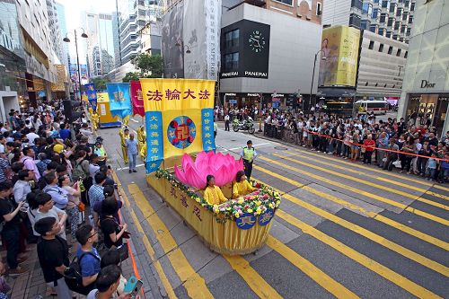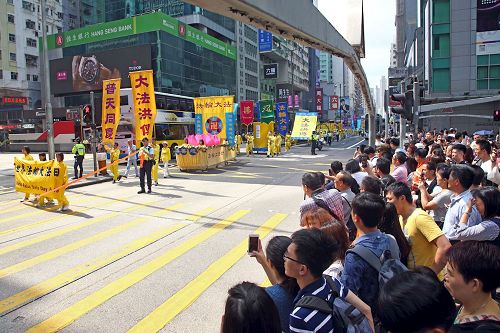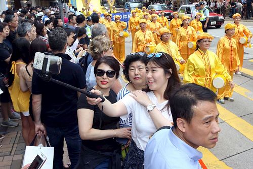 '图6~11:法轮功学员游行庆祝“世界法轮大法日”,及“法轮大法弘传世界二十五周年”纪念,吸引香港市民及中西游客驻足关注及拍照。'