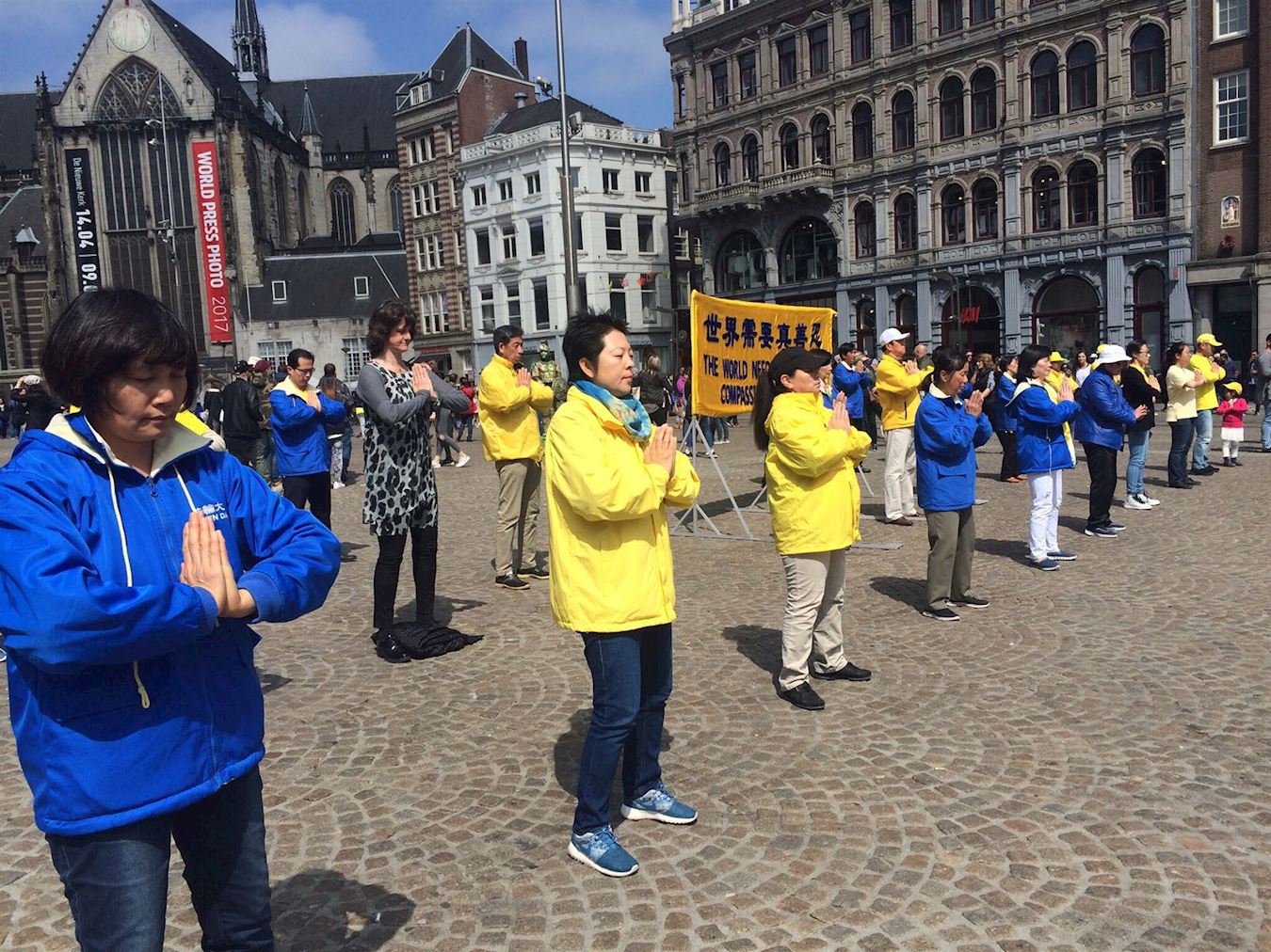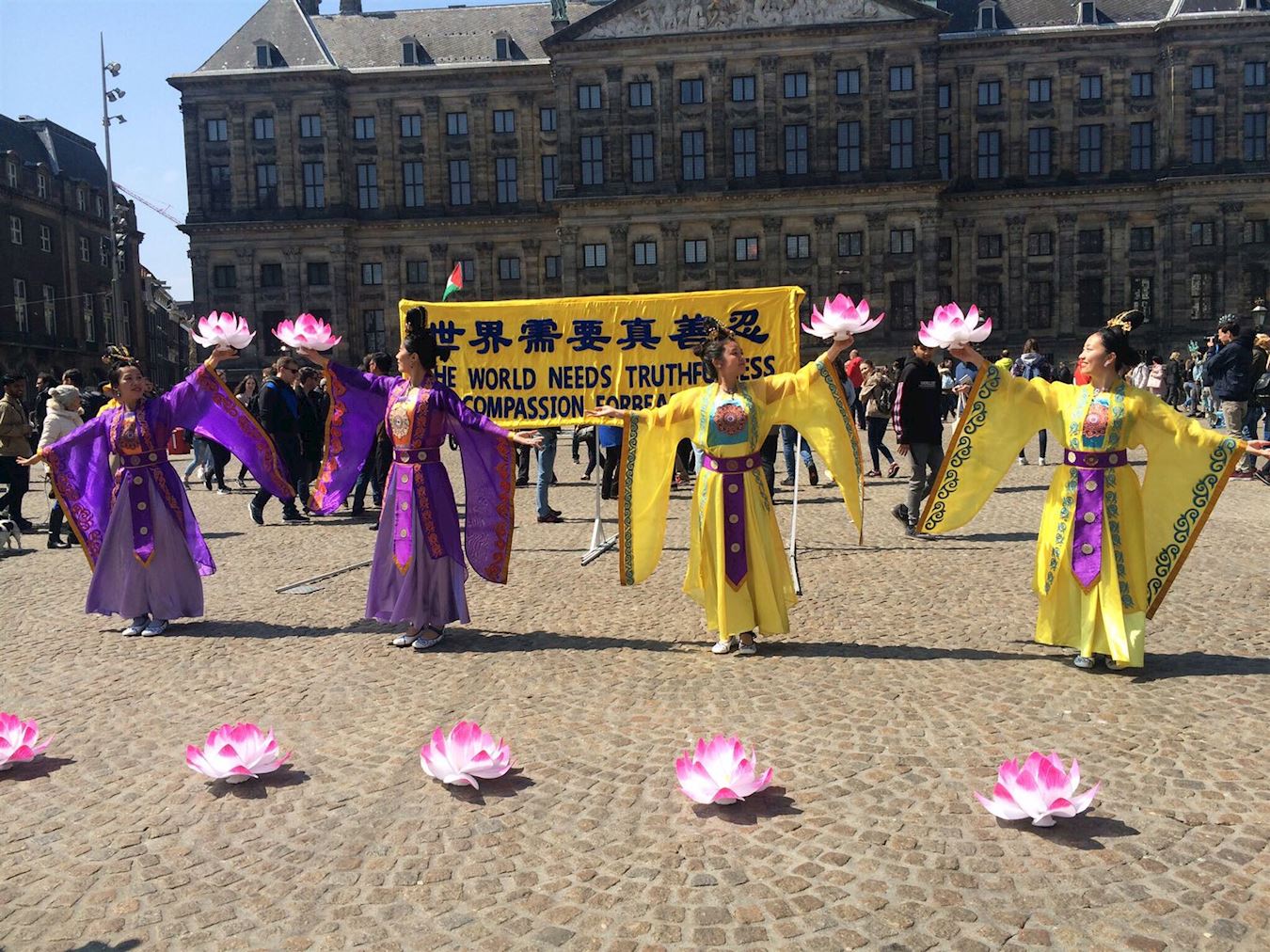 在达姆广场,“世界需要真善忍”的金色横幅在蓝天下分外醒目。学员们主要采用集体炼功及讲真相的形式,间或穿插舞蹈表演以及歌唱,向南来北往的行人传递真、善、忍的讯息,展示修炼者的风貌。