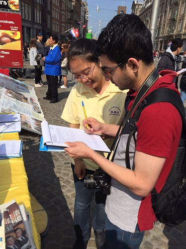 三位来自荷兰的年轻女性向学员询问什么是法轮功,以及中国政府为什么要迫害法轮功。听到学员的介绍后她们都很气愤,马上在征签簿上签了字,其中一位说;“这太不应该了,这么好的理念—真、善、忍,对身体又这么好,有什么不对?!”“为什么要迫害,简直太荒唐了!”