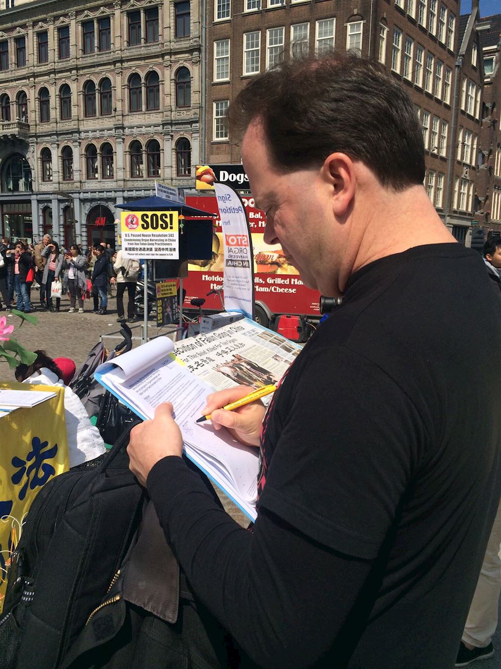 图3-4:达姆广场上,路人了解真相后,签名支持法轮功学员反迫害