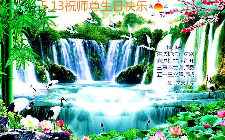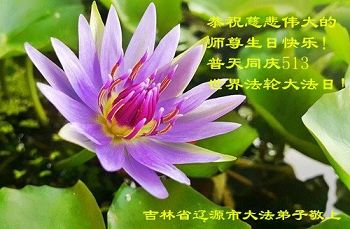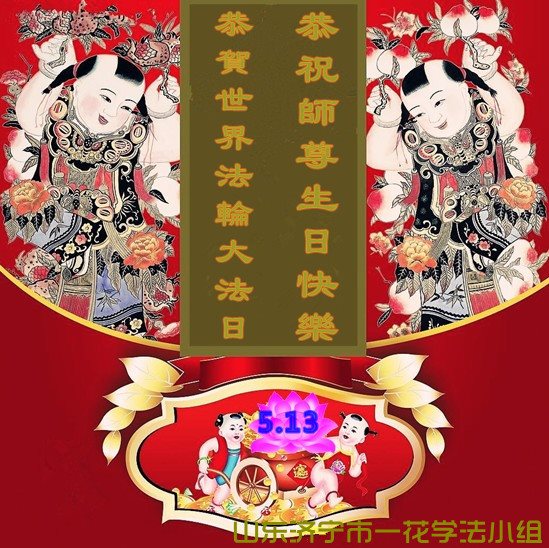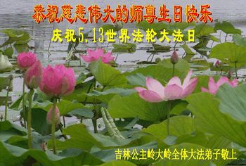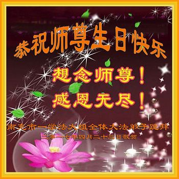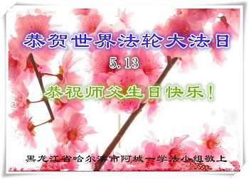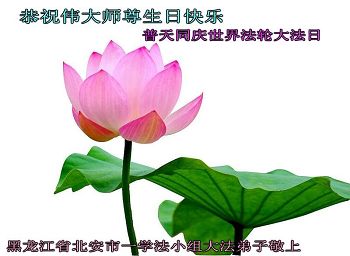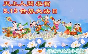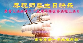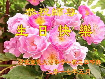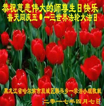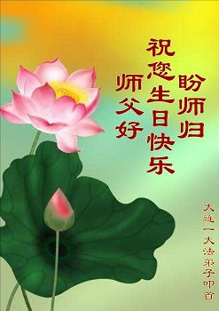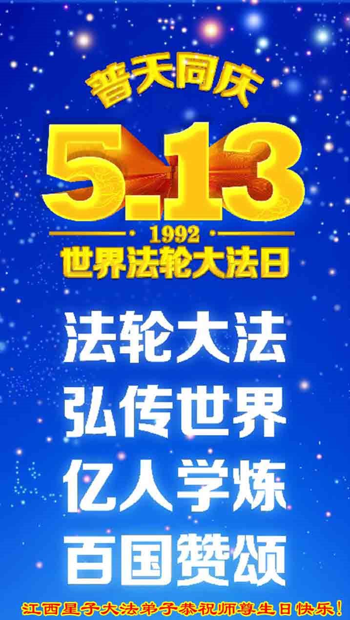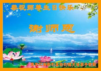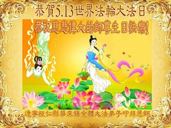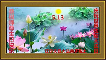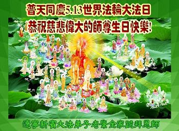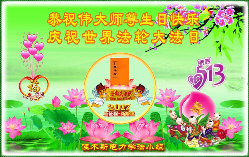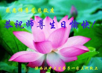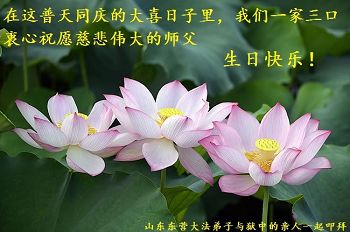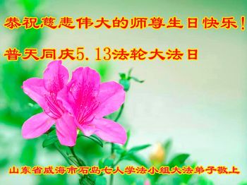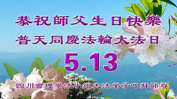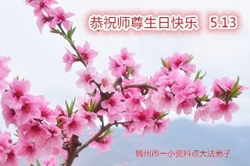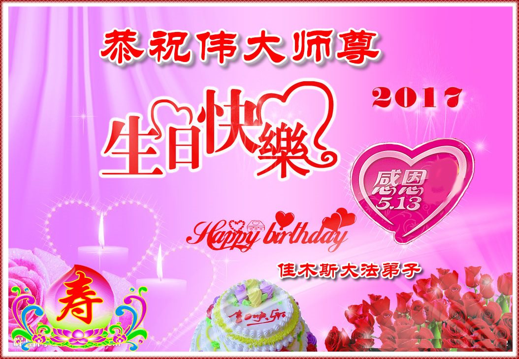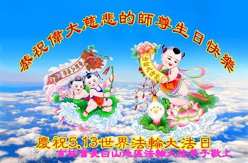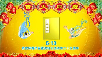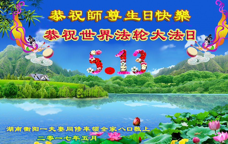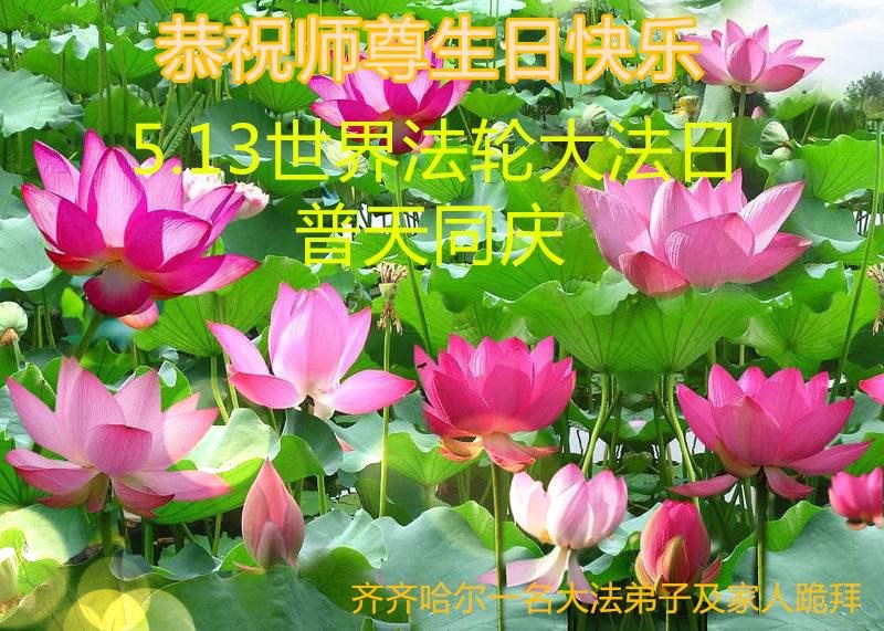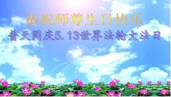 在五一三这个普天同庆队伟大时刻,我和我的家人在此恭祝:恭祝慈悲伟大的师尊生日快乐!为了芸芸众生得救,师父,您辛苦了!在此也祝贺:法轮大法洪传二十五周年!