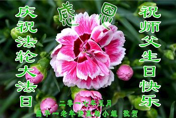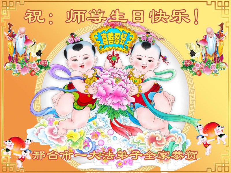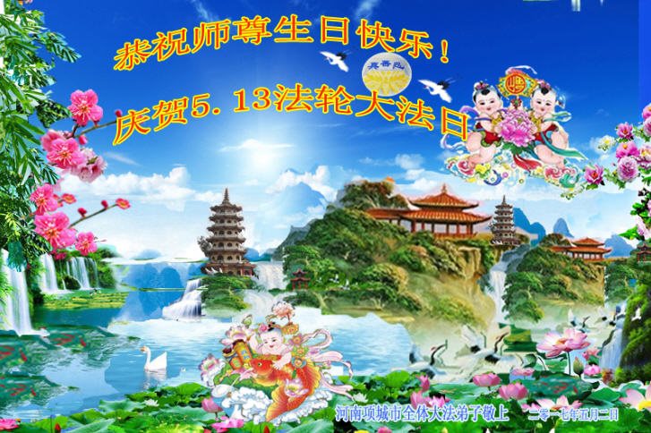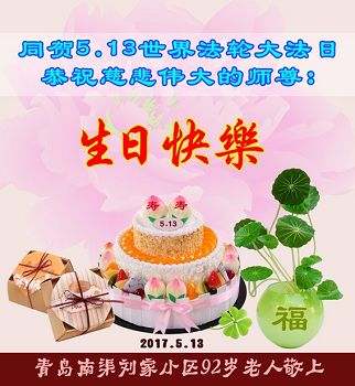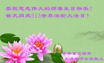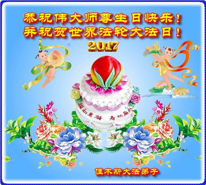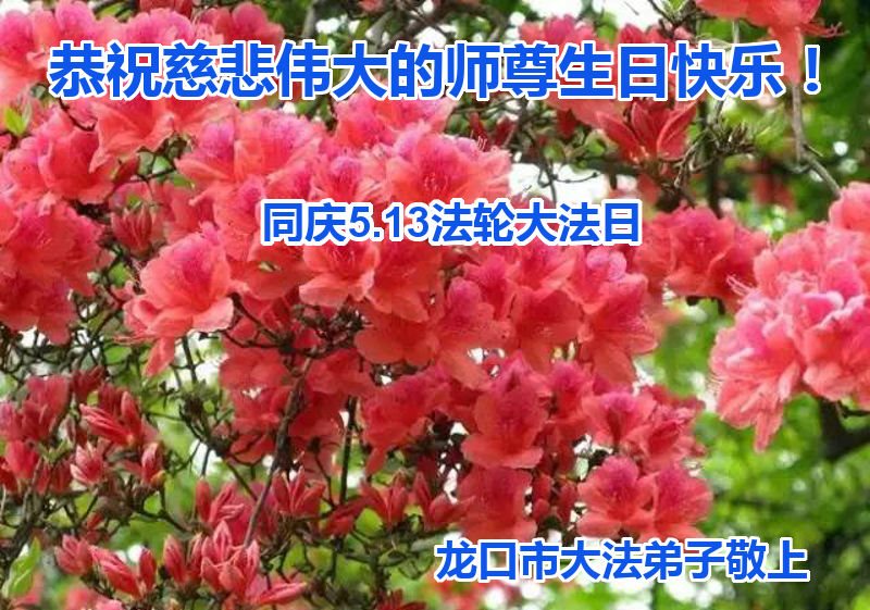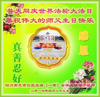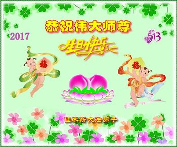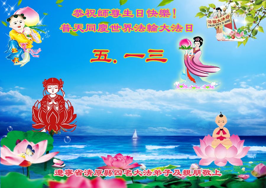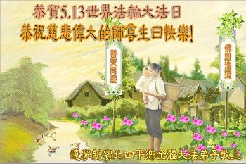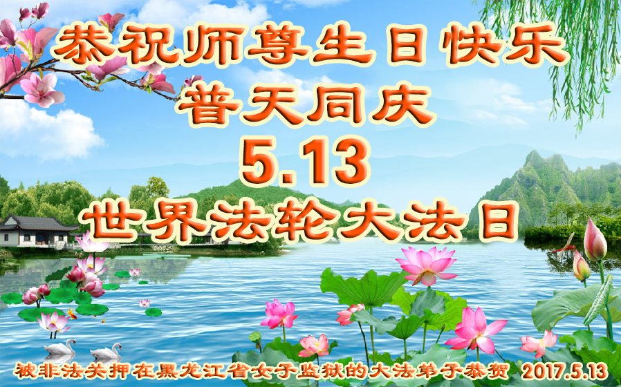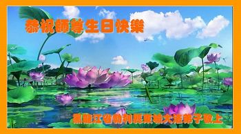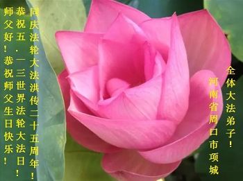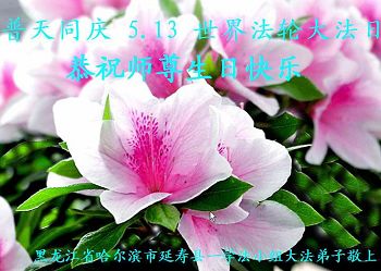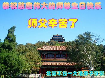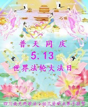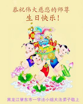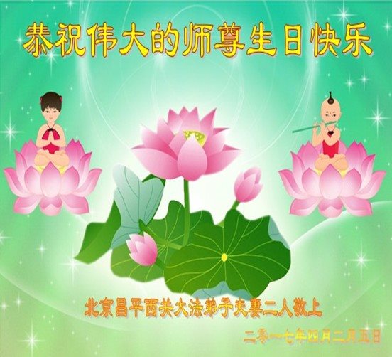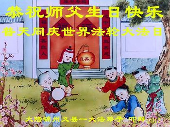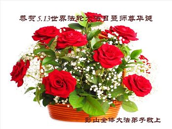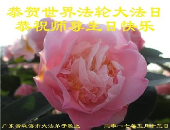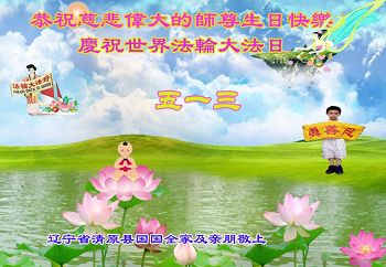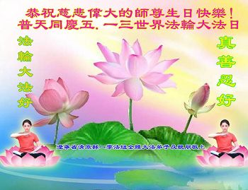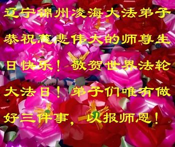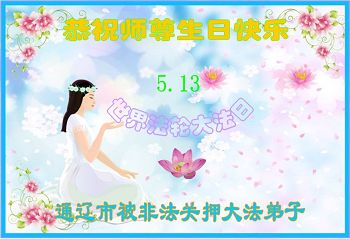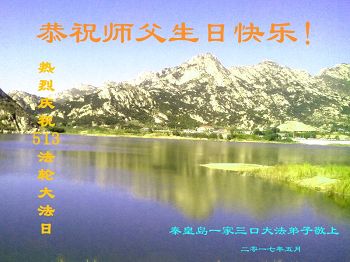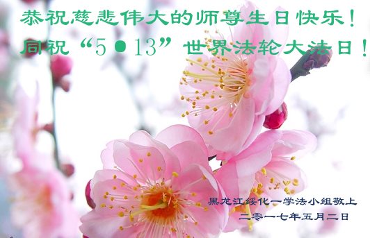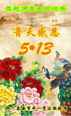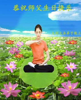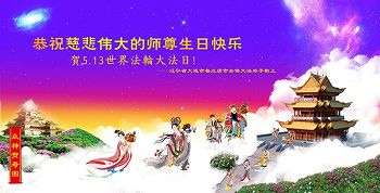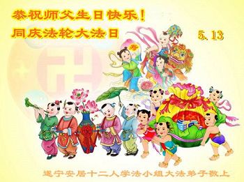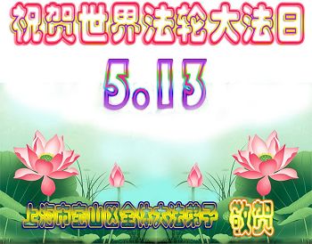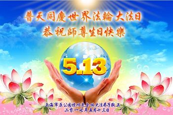 在五一三这个普天同庆队伟大时刻,我和我的家人在此恭祝:恭祝慈悲伟大的师尊生日快乐!为了芸芸众生得救,师父,您辛苦了!在此也祝贺:法轮大法洪传二十五周年!