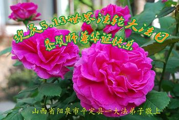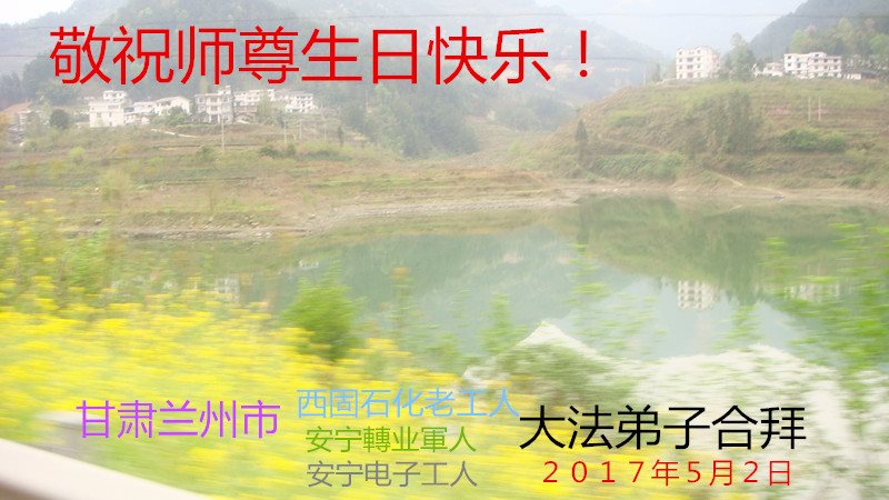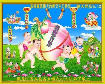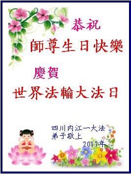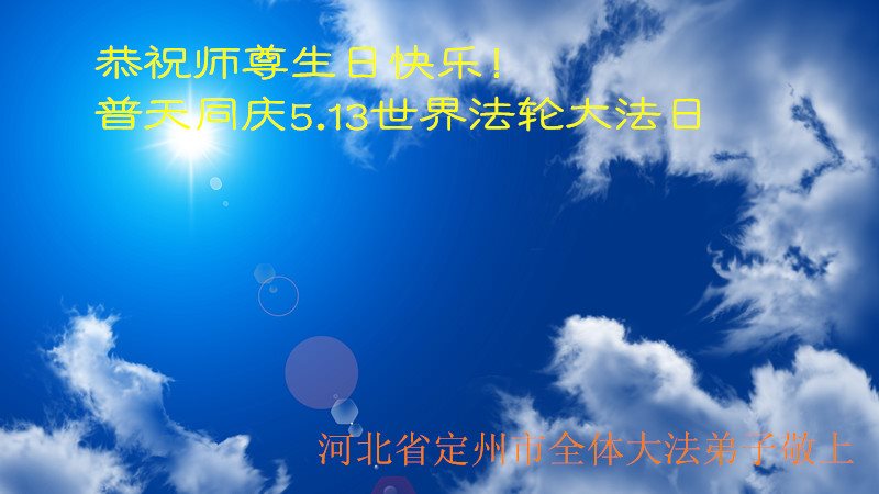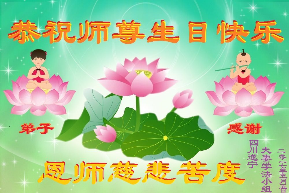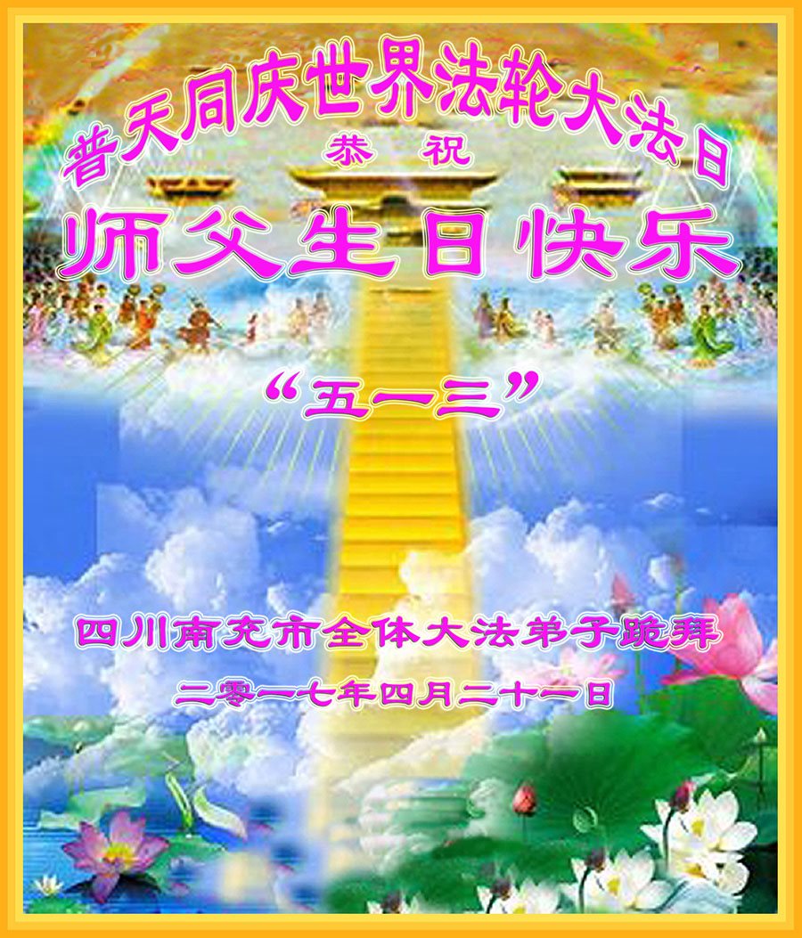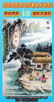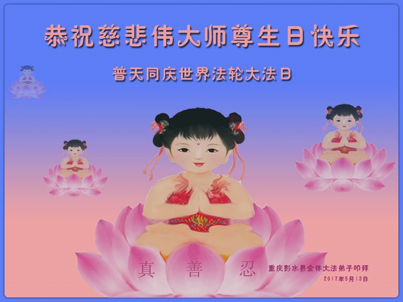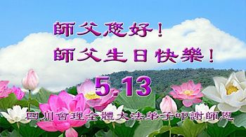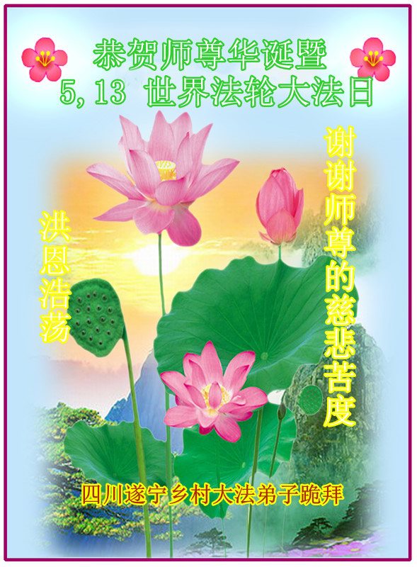 5.13是一个特别伟大的日子,是全世界大法弟子共同的节日。在此我们遂宁市乡村大法弟子恭祝师尊生日快乐! 师父辛苦了!谢谢师父的慈悲救度!在这正法的最后时间里,弟子一定珍惜师父以巨大付出所延长来的时间,圆容师父所要的,扎扎实实的做好三件事,学好法,讲真相、救众生,不辜负师父的慈悲救度,不辜负众生的期盼!惟愿师尊笑,圆满随师还。叩拜师尊!