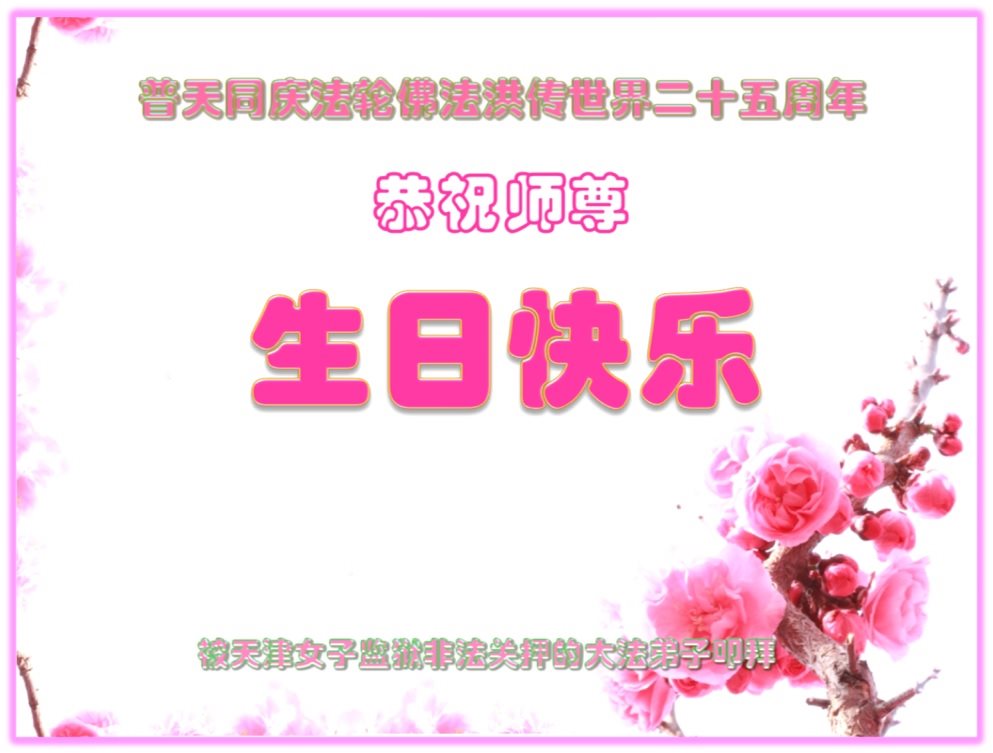 被天津滨海监狱非法关押的大法弟子在法轮佛法洪传世界二十五周年之际,叩拜恩师!红墙铁铐消不弱弟子同化“真、善、忍”宇宙特性的坚强意志,关不住返本归真的善心真念,在法轮大法日弟子们恭祝师父生日快乐!