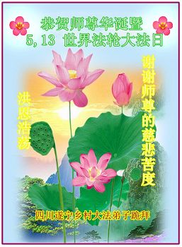 在这普天同庆的日子,我们全村的大法弟子叩谢师恩,无以言表对师尊的感激,我们会在以后的道路上更加精進,互相配合好,不负师尊的慈悲救度。谢谢师尊、谢谢师尊。