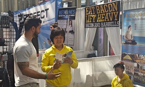 【明慧网二零一七年六月一日】二零一七年专业超级秀于五月二十七日和二十八日,在多伦多大都会会展中心举行。这是加拿大安省参加人数最多的健身、营养展览会,多伦多法轮功学员也前来设立了展位,向前来参加展会的各界人士介绍法轮大法的美好,并免费教功。前来展位咨询的人士络绎不绝,有的还现场学功。