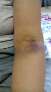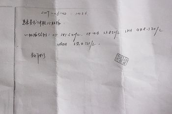 A到家一看,胳臂被抽血的地方青紫(照片为证),身体多处疼痛。随文附体检单和胳臂照片。因为没有报名字被写成法轮功女 无名氏3。