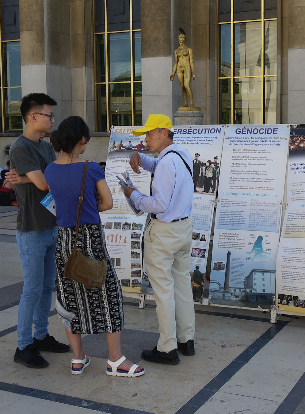 【明慧网二零一七年六月二十日】(明慧记者周文英巴黎报道)二零一七年六月十八日星期日下午,和往常的周日一样,巴黎部份法轮功学员在艾菲尔铁塔下的人权广场举行炼功和讲真相的活动。时值旅游旺季,来自世界各地的游客络绎不绝。艾菲尔铁塔下,法轮功学员的活动吸引着游客的视线。