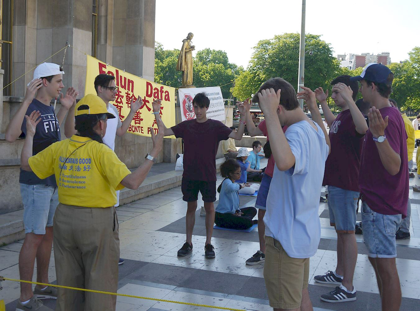 十七岁的卡米莉亚(Camilia)是高中生,住在法国比卡第(Picardie)。上个星期日她在人权广场遇到法轮功。仔细阅读了展板上的内容,她了解到法轮功学员在不公正的对待下仍然坚持讲真相,同时传递真、善、忍的信息,她便萌生一念,也想打坐炼功。这个星期日她乘一小时火车到巴黎,整个下午从两点到六点,她都在学炼法轮功。她很高兴,感觉精神上得到了很好的休息。她还说暑假到了,她会经常来巴黎炼功。
