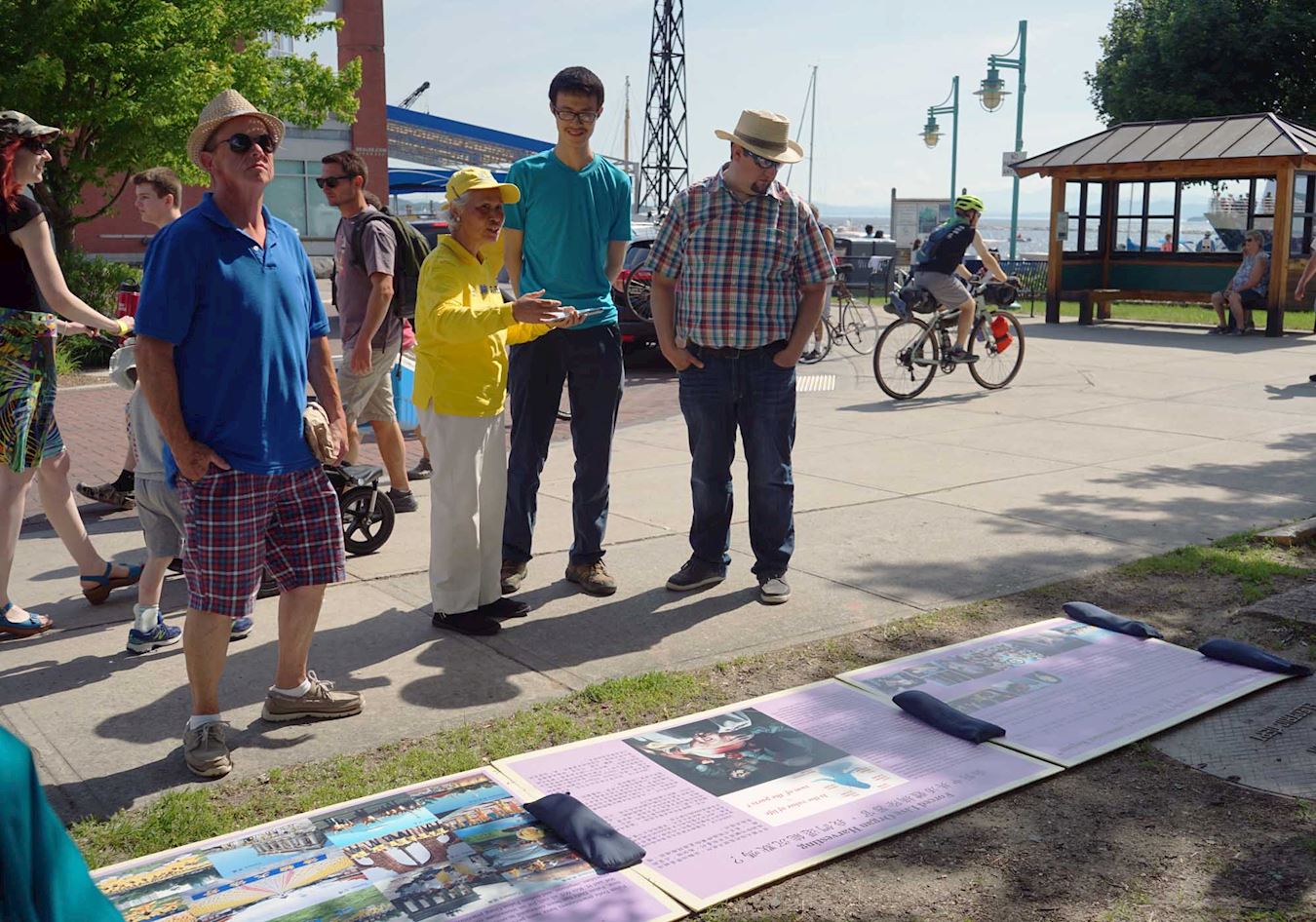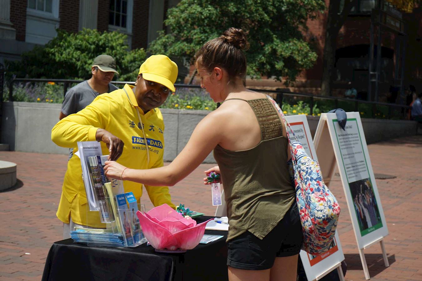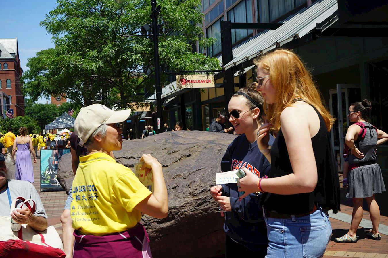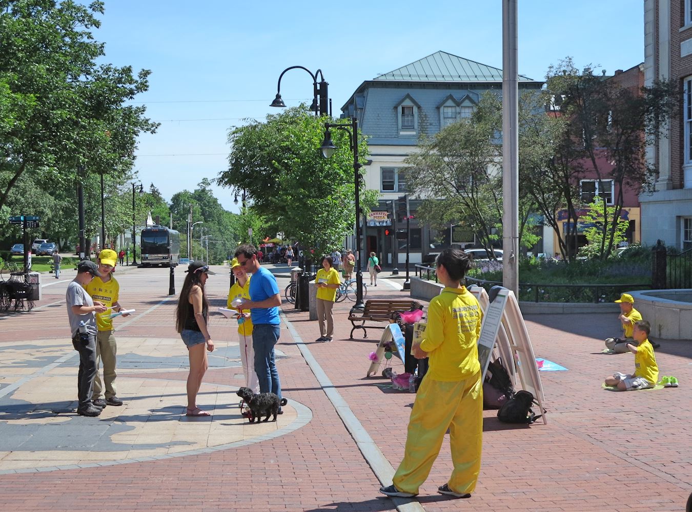 图7:法轮功学员在佛蒙特州伯灵顿市街区给游人讲法轮功真相。