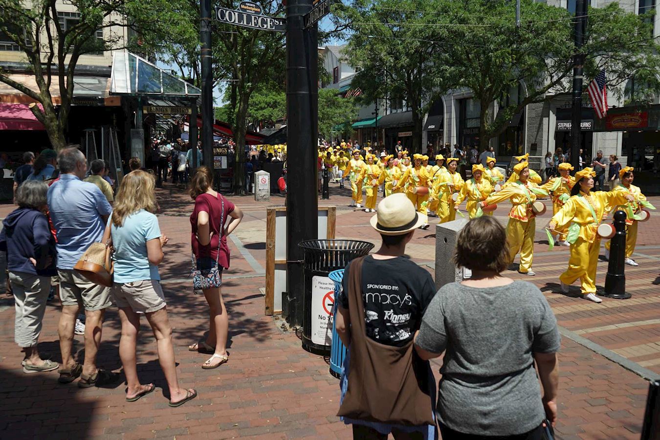 图1~2:法轮功学员的游行队伍穿过佛蒙特州伯灵顿市市中心和热闹的街区,吸引路人驻足观看。