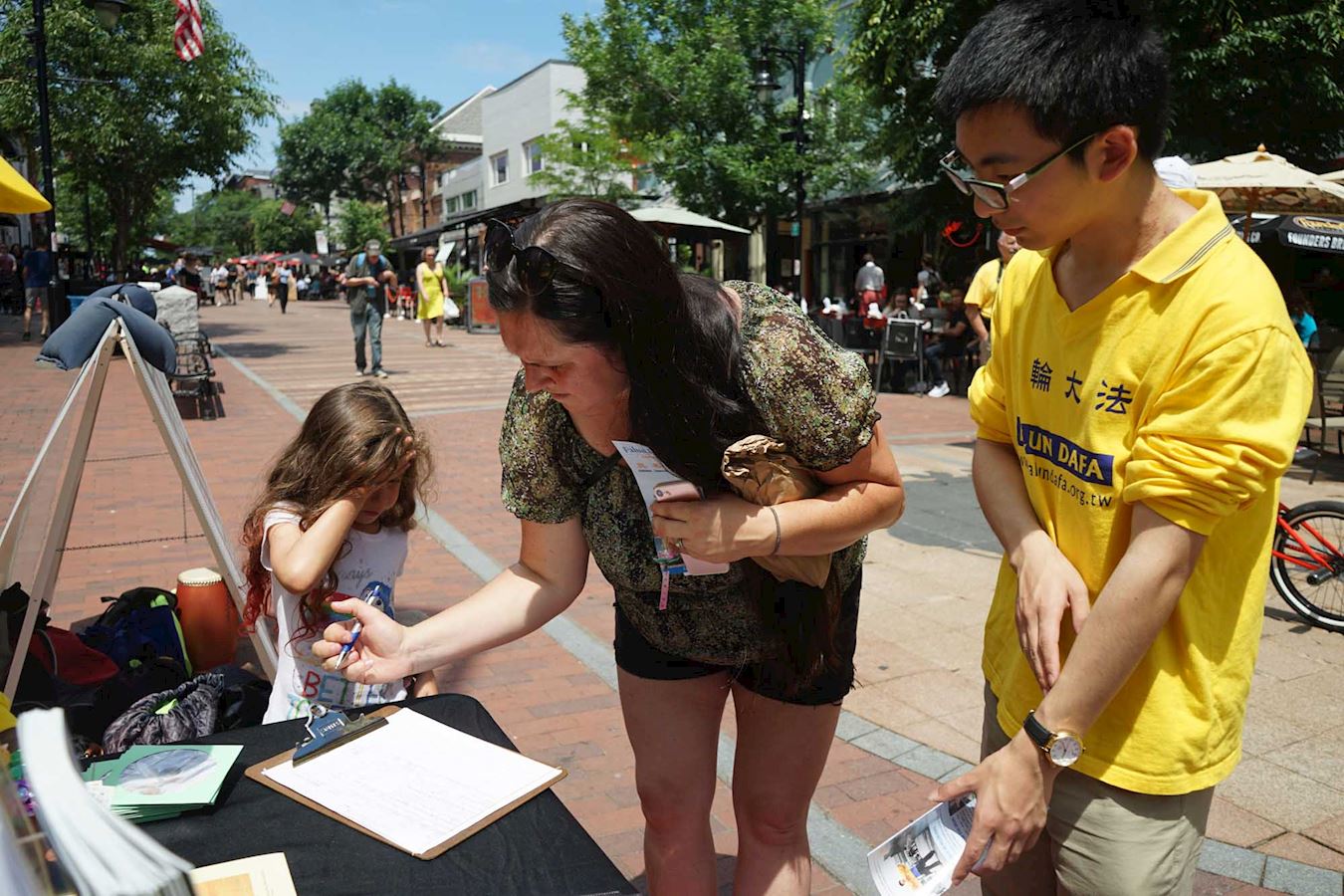 图6:这位带着女儿的母亲听完法轮功学员的讲解后,在反酷刑及活摘的征签表上签名。
