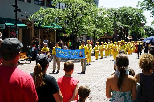图1~2:法轮功学员的游行队伍穿过佛蒙特州伯灵顿市市中心和热闹的街区,吸引路人驻足观看。