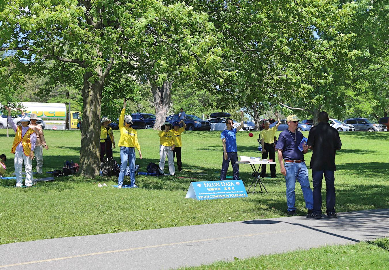 图2:龙舟节上,法轮功学员在姆尼斯河畔(Mooney's Bay)集体炼功并向游客讲真相。