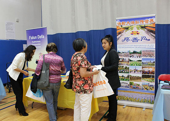 法轮功学员在展桌上展示了法轮功的主要著作《转法轮》,还有介绍法轮功的各种真相资料等,同时向来宾分享自己修炼法轮功之后身心受益的经历……