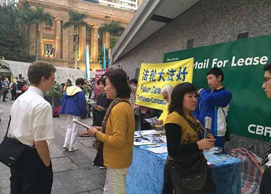 6月23日,法轮功学员在布里斯本市中心中领馆对面的乔治国王广场举办讲真相活动,许多行人在制止迫害、反活摘的征签表上签名,支持法轮功。