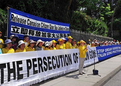 六月二十五日下午,法轮功学员及支持者在温哥华中领馆前举行和平抗议,谴责中共对加拿大公民孙茜的非法关押,拘留与不公对待。