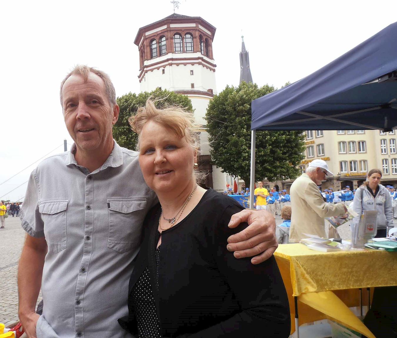 来自杜塞尔多夫附近城市的伊露娜·达门(Ilona Damen)和丈夫拉尔夫·达门(Ralf Damen)都在当地政府部门做管理工作。伊露娜一字一句非常清楚地表示:“我们今天是第一次听到(法轮功被迫害和活摘器官)的事,这是对人的压制,对人类的蔑视和对人类价值的否定(unterdrückend, Menschen verachtet, Menschen unwürdig)!我们必须联合成一体,不能对这样的罪恶置之不理!”