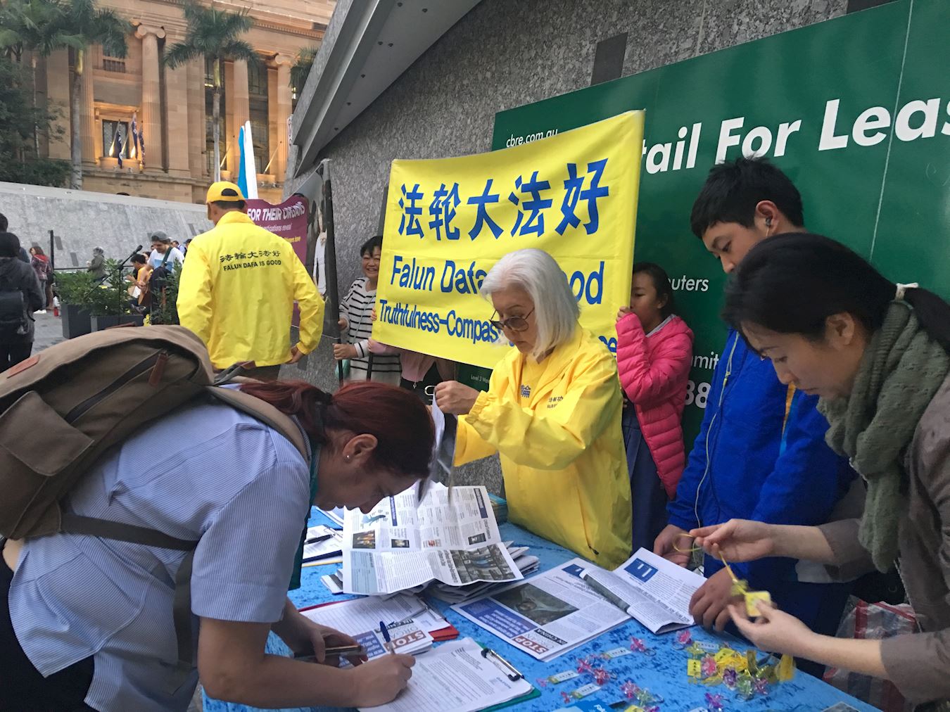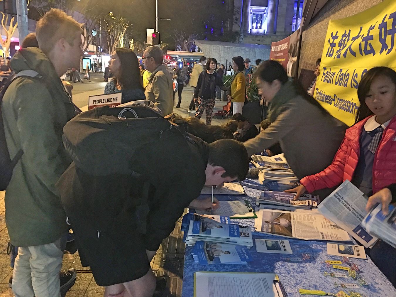 还有两位年轻人,是来自大陆的游客。他们在征签桌前停留了很久,了解了很多真相,还拿了《九评》书及真相DVD光盘。当学员劝他们“三退”时,他们欣然同意,并深表感谢。
