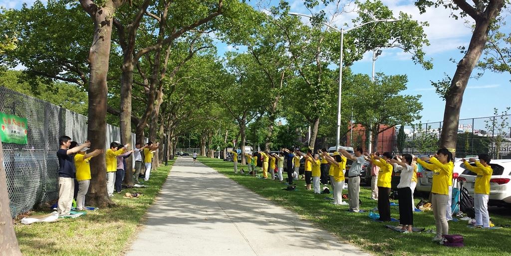 图1:二零一七年六月二十五日,纽约新泽西部份法轮功学员再次来到纽约布鲁克林的华人社区晨炼,向当地民众介绍法轮功。