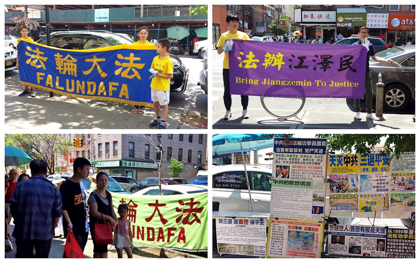 炼完五套功法后,学员们来到布鲁克林区华人最集中的地段,展开书写着“法轮大法好”,“真善忍”,“停止迫害法轮功”,“制止中共活摘法轮功学员器官”,“法办江泽民”等文字的明亮醒目的横幅,并向过往行人发放介绍法轮功,讲述法轮功遭到中共血腥迫害的真相,同时劝中国人三退。