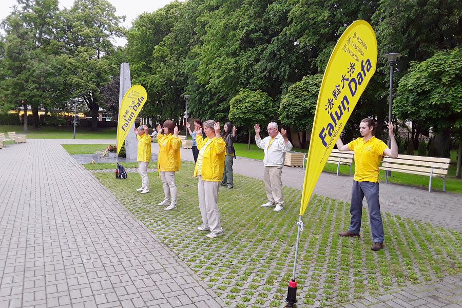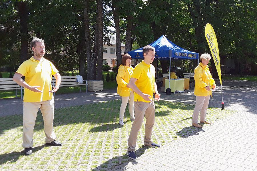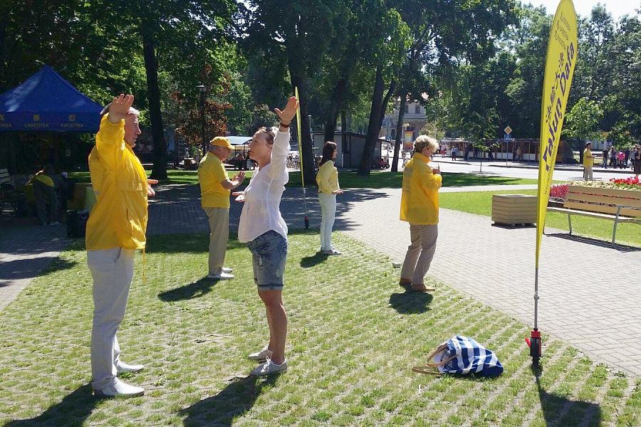 当天阳光明媚,法轮功学员们在通往大海的大道旁设置了真相摊位。法轮功学员一开始炼功,帕兰加市的市民,以及外国游客就开始驻足观看。许多立陶宛人还没有听说过法轮功,当法轮功学员跟他们介绍真相时,他们都很感兴趣。